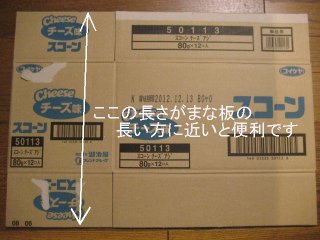 まな板の”長い方”が矢印の長さにちょうど収まるとダンボールをカットしないで済むので便利です。