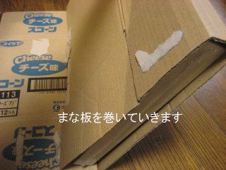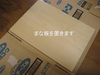 ダンボールの上にまな板を置きます。