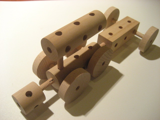 貫通穴組み木、5cmの直径車輪、6cmと10cmのダボ棒を使用